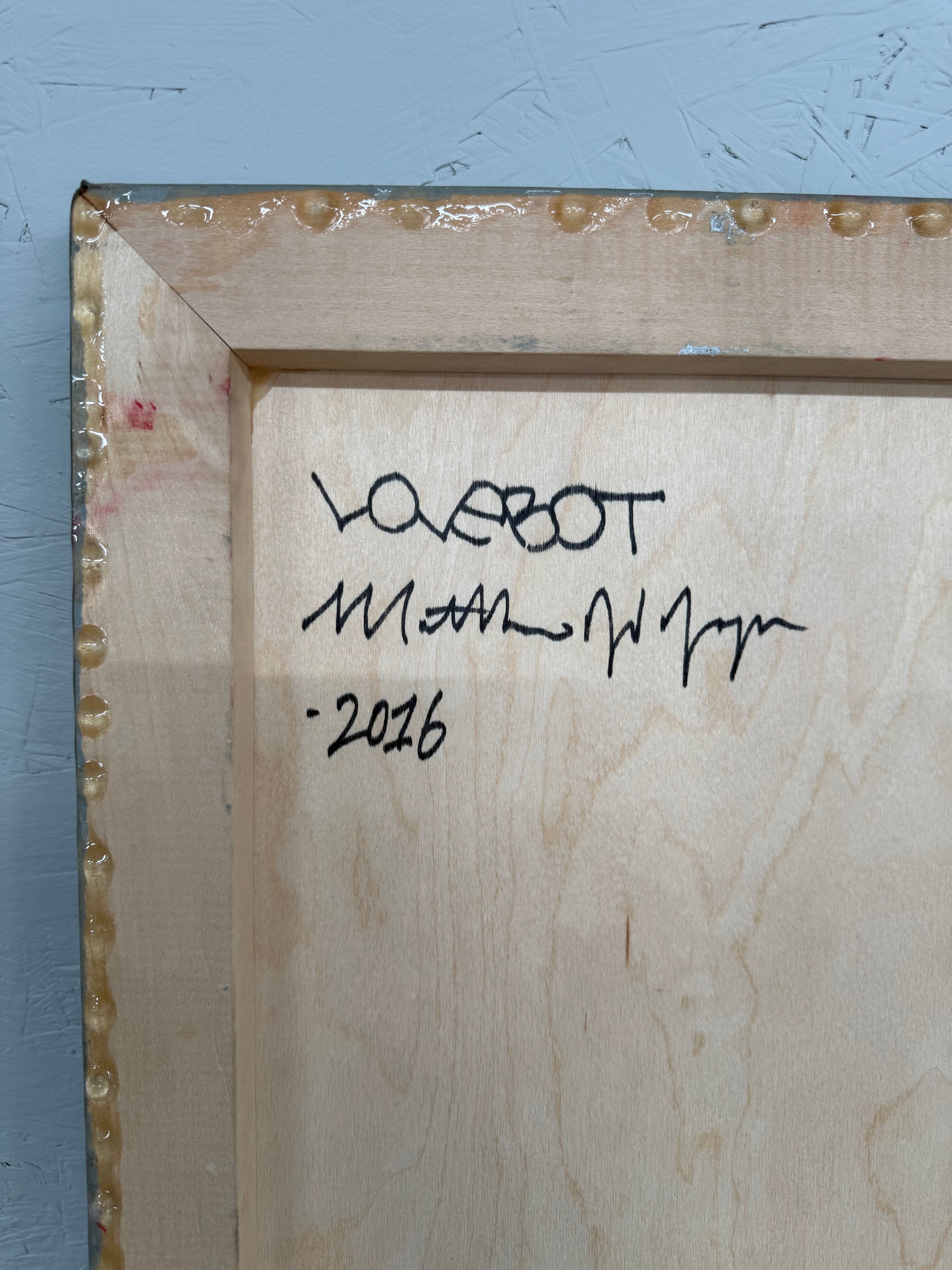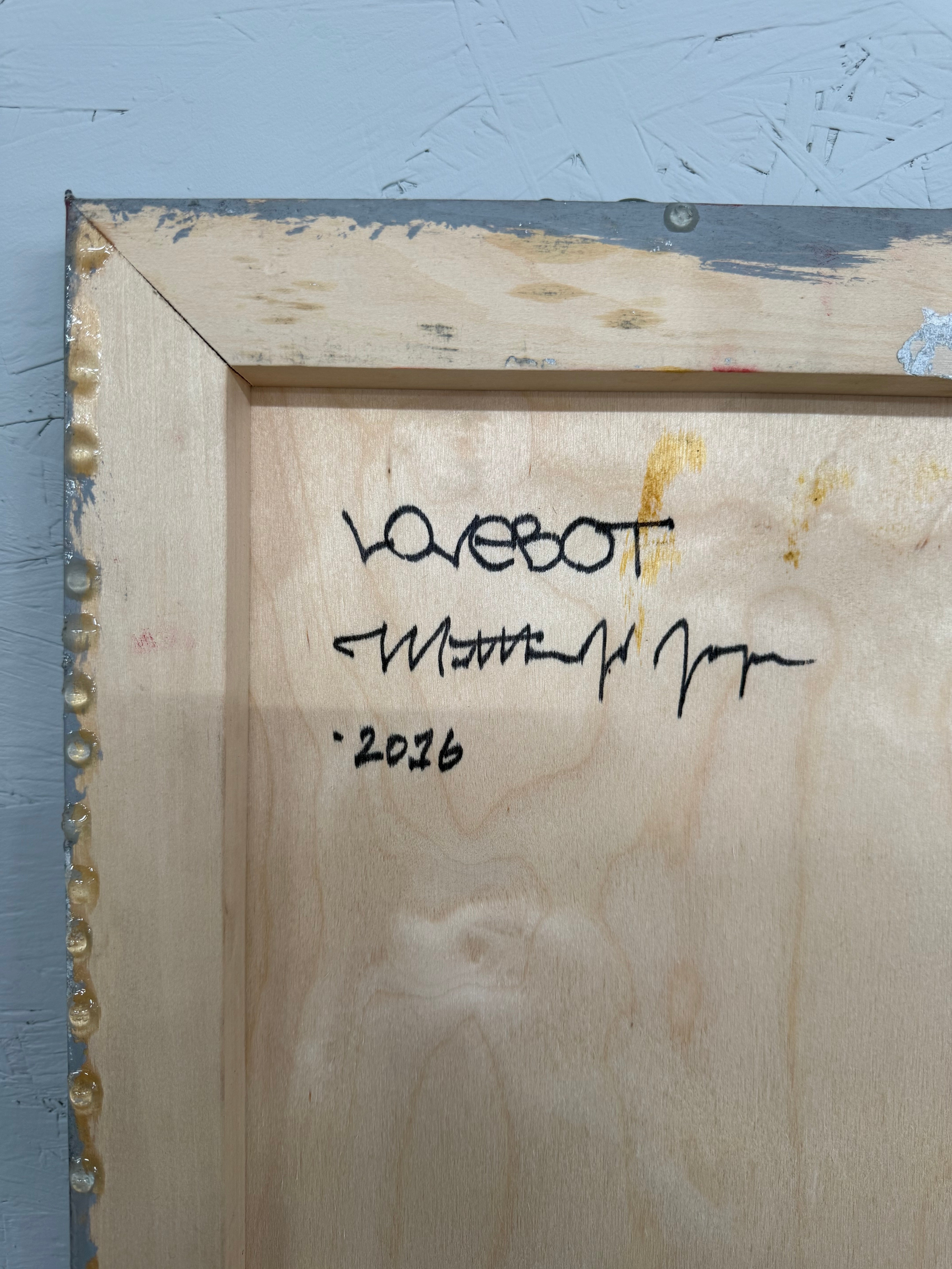 16-inch square original artwork. This gloss resin-coated work featured burnt chrome spray paint, a silk-screened Lovebot and a one of a kind circuit board letter V. This unique rare item...