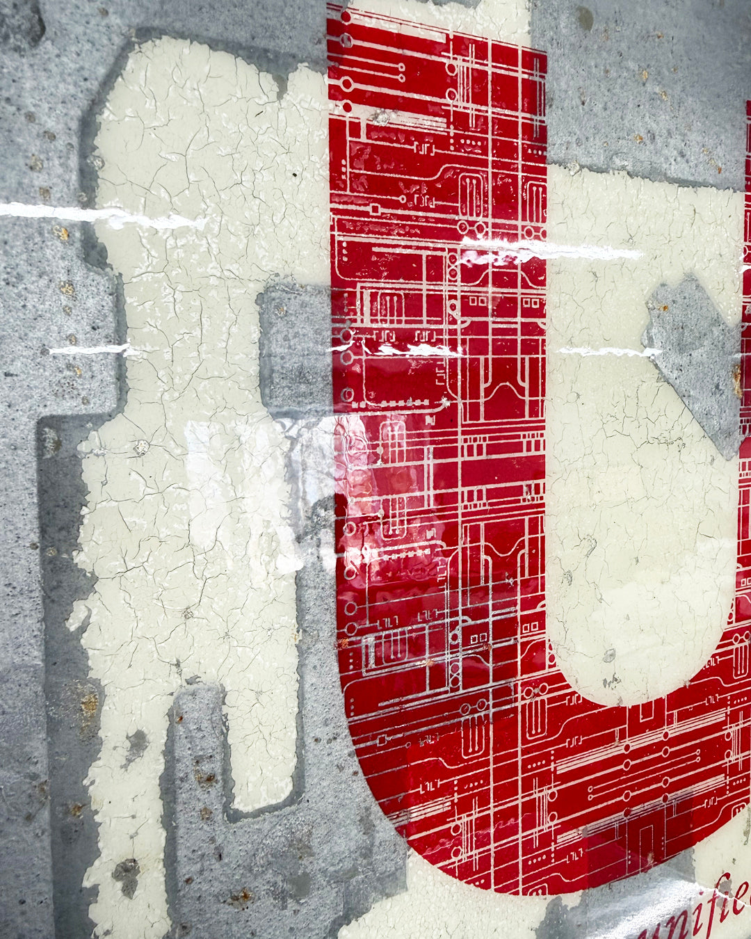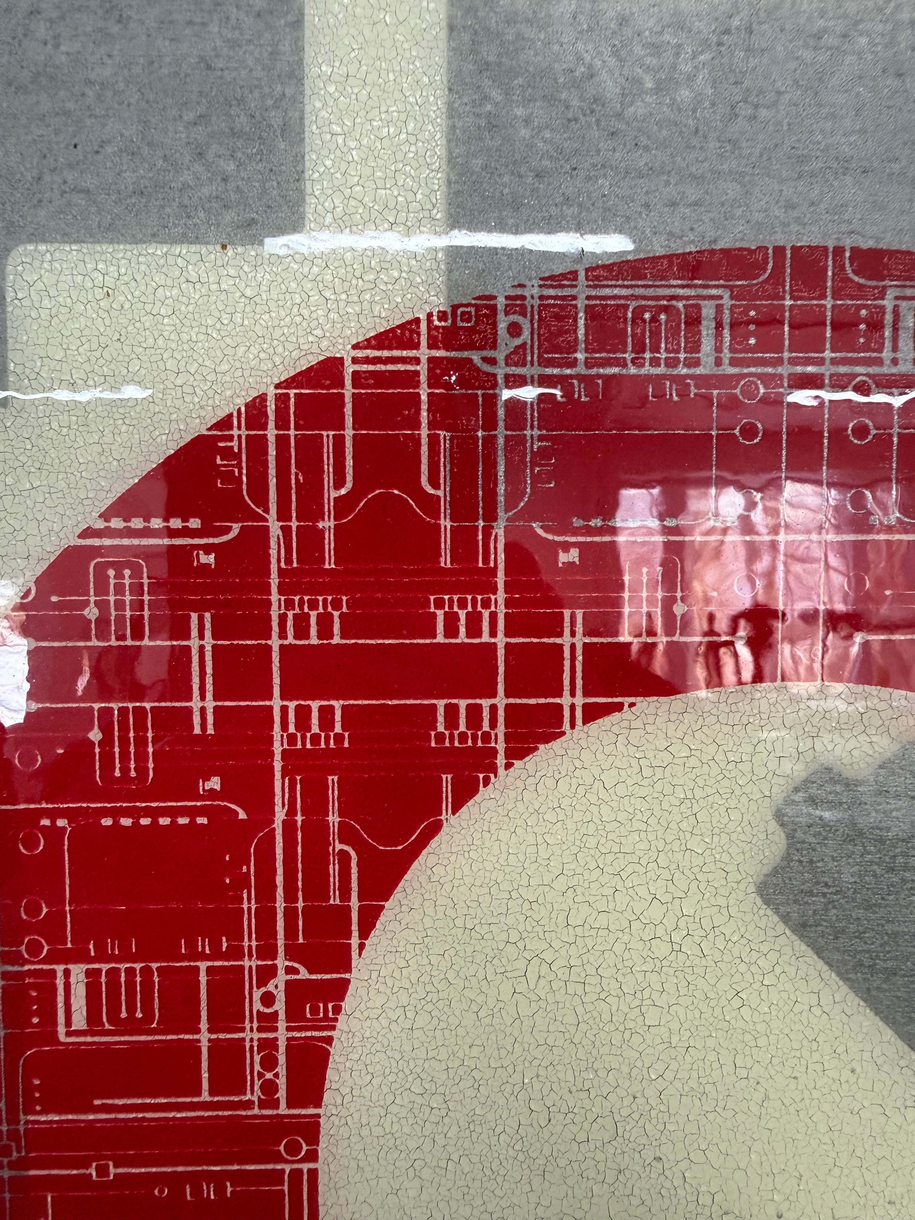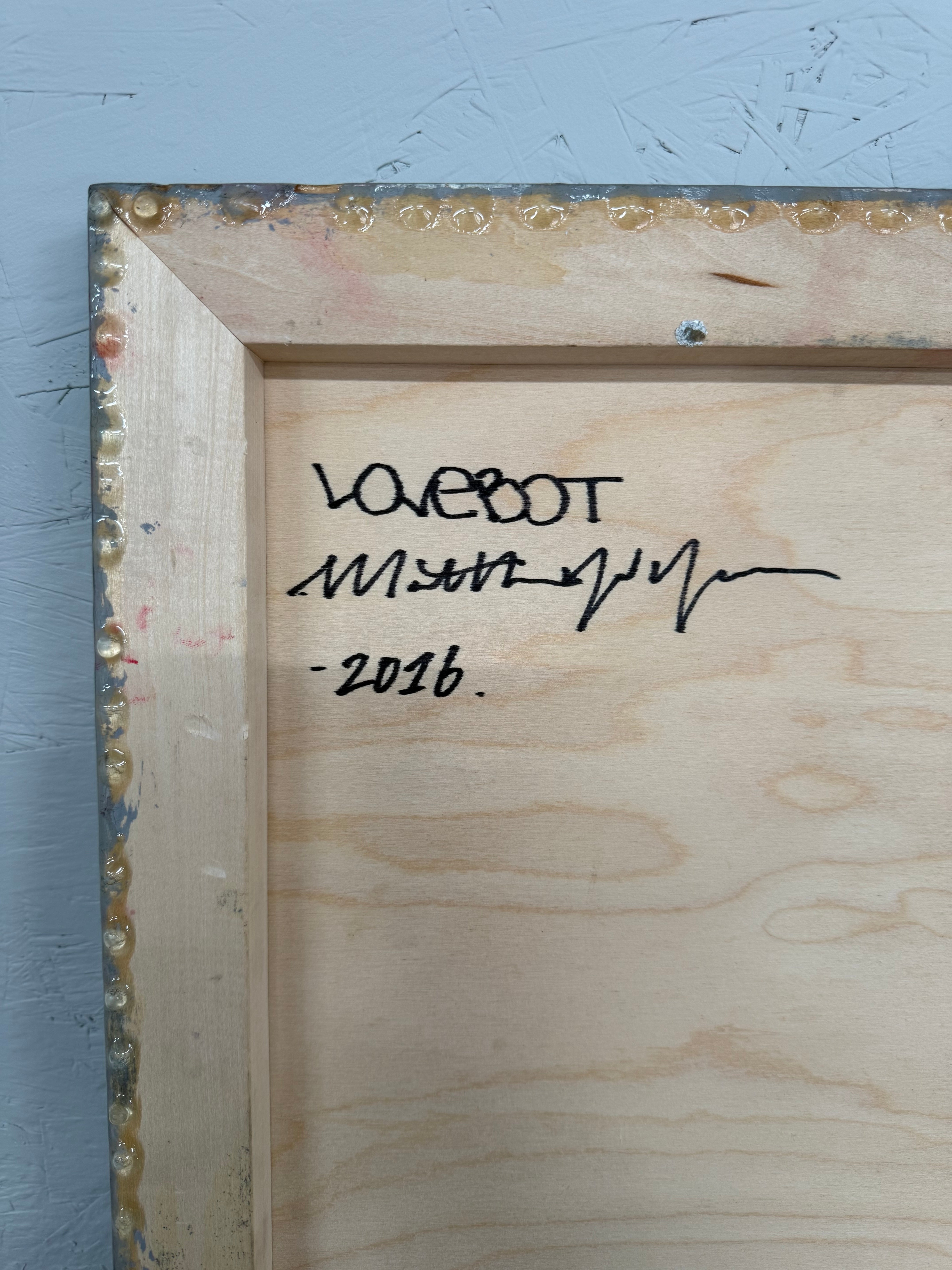 16-inch square original artwork. This gloss resin-coated work featured burnt chrome spray paint, a silk-screened Lovebot and a one of a kind circuit board letter U. This unique rare item...