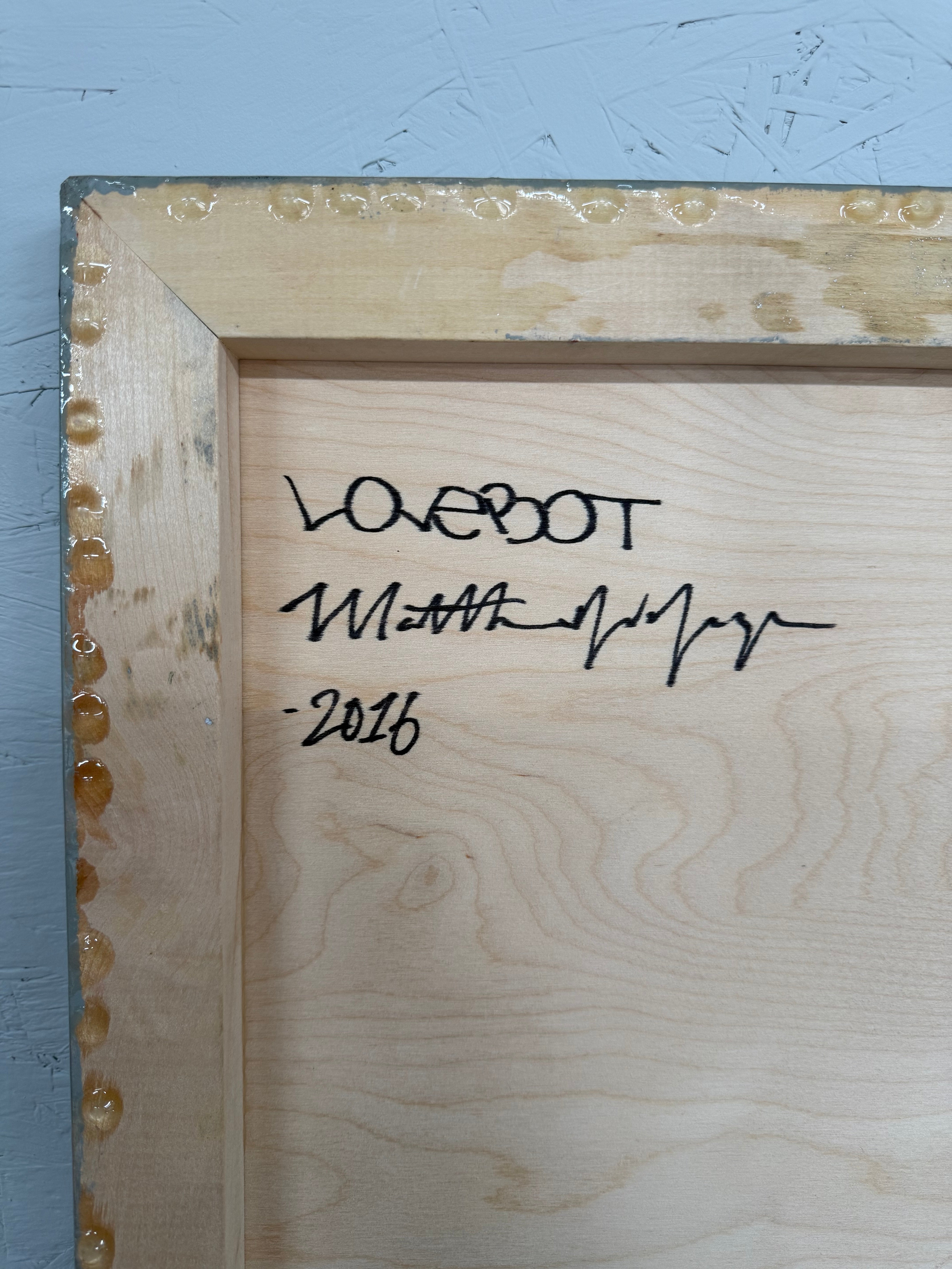 16-inch square original artwork. This gloss resin-coated work featured burnt chrome spray paint, a silk-screened Lovebot and a one of a kind circuit board letter H. This unique rare item...